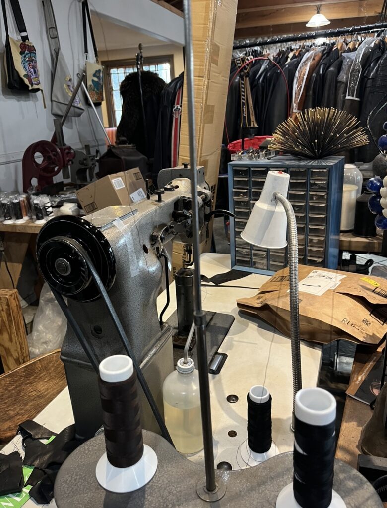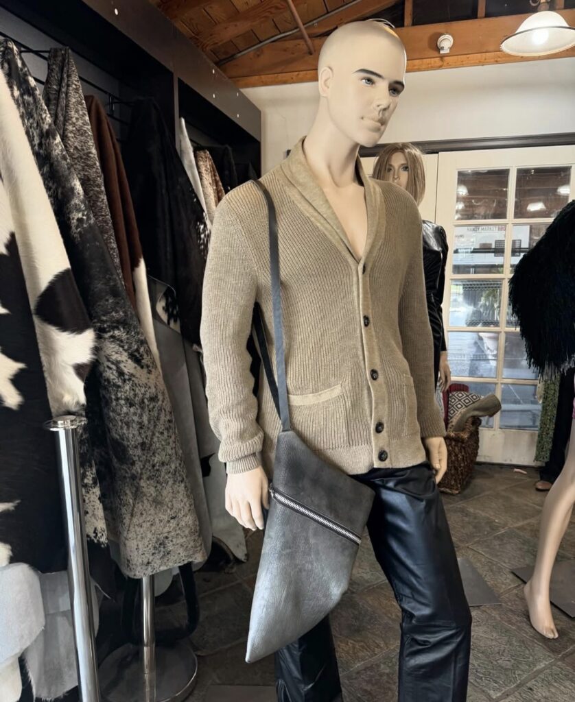 Jackie specializes in custom handmade leather bags for both men and women. She collects unique leather hides and sometimes hand stains or distresses them herself to achieve the exact colors and textures she wants. From choosing the leather to selecting the hardware and stitching details, every element is carefully considered. Spending time in the shop and looking closely at the pieces makes it clear that these bags are not factory products. Each one reflects Jackie’s artistic prowess and two decades of experience.